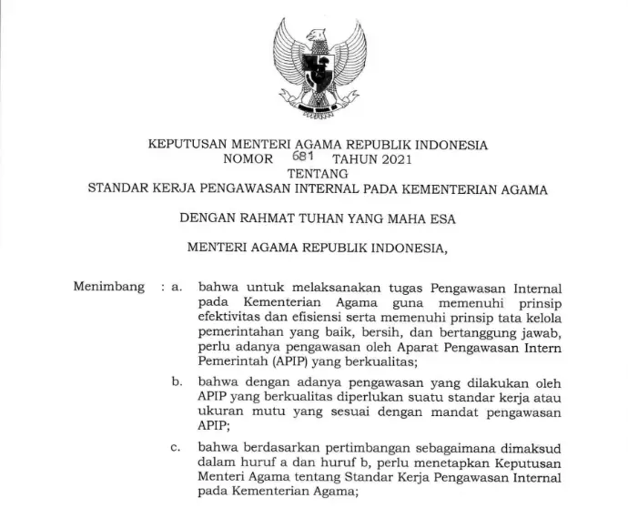 Keputusan Menteri Agama Republik Indonesia Nomor 681 Tahun 2021 Tentang Standar Kerja Pengawasan Internal Pada Kementerian Agamа.