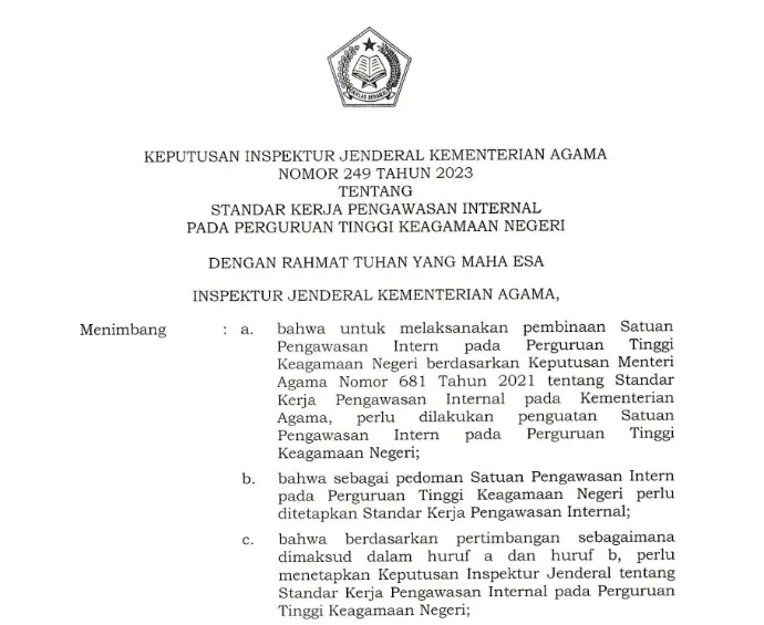 Keputusan Inspektur Jenderal Kementerian Agamа Nomor 249 Tahun 2023 Tentang Standar Kerja Pengawasan Internal Pada Perguruan Tinggi Keagamaan Negeri.